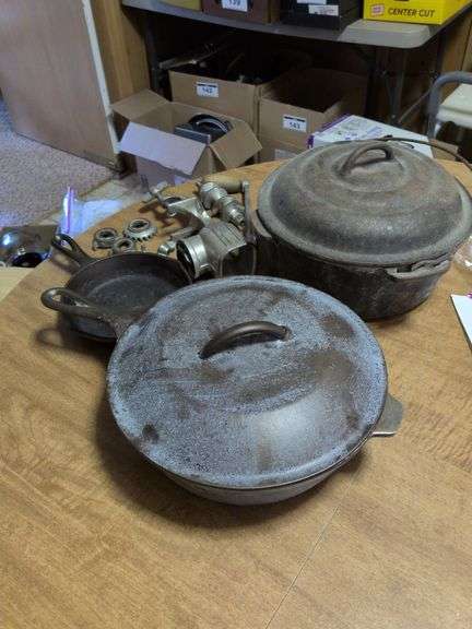 LOT 148 - Cast iron Ozark Dutch Oven, Chicken Fryer, Small Skillet, Meat Grinder