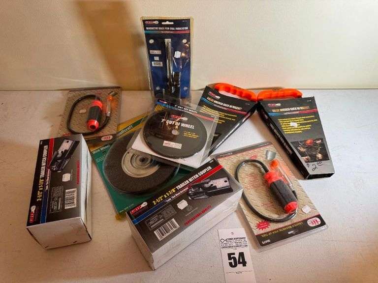 LOT 54 - Large Wrench Rack w/Magnet, 3pc Safety Kit, Trailer Hitch Couplers, and more!