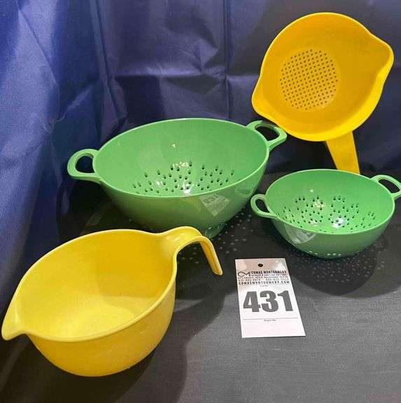 LOT 431 - 2 - Melamine Colanders, 1 Vintage Tupperware Colander, Rubbermaid Vintage Batter Bowl