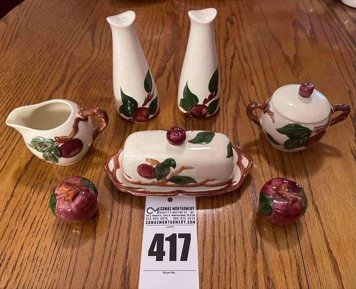 LOT 417 - Franciscan Apple pattern covered butter dish, matching Oversized Salt & Pepper Shakers, Sugar & Creamer & small Apple Salt & Pepper Shakers