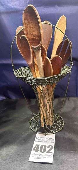LOT 402 - Vintage Wooden Spoons in a Woven Wire Basket