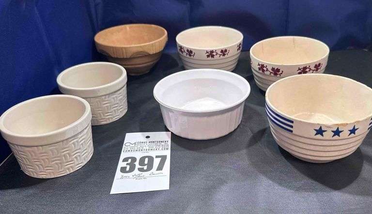 2 - Ramekins, Corning ware Bakeware, Antique Stoneware Yellow/Tan Bowl, Vintage Cream & Blue Stars & Stripe Bowl, 2 - Vintage Beehive Crock Bowls with Red Maple Leaf Pattern