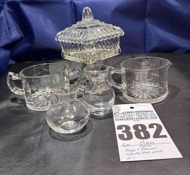 LOT 382 - 6 pcs - Etched Sugar & Creamer (2 1/2"T), 1 - candy dish with lid (7"t), 2 Vases (3" & 2 1/2")