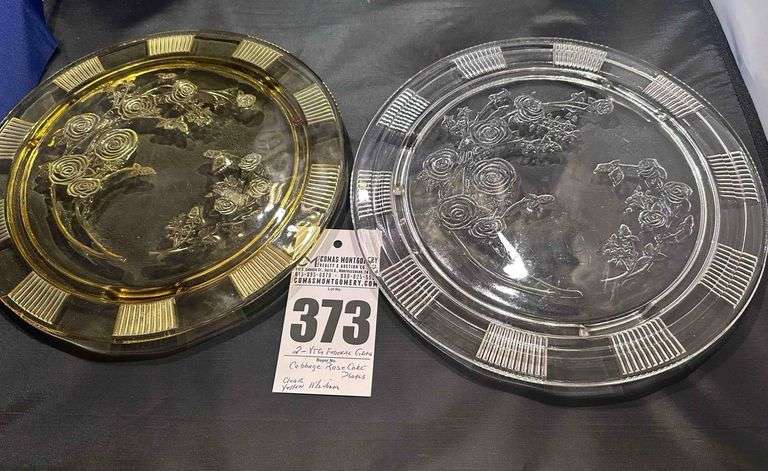 LOT 373 - 2 - Federal Glass Depression Glass Cabbage Rose Cake Plates, One Yellow & One Clear