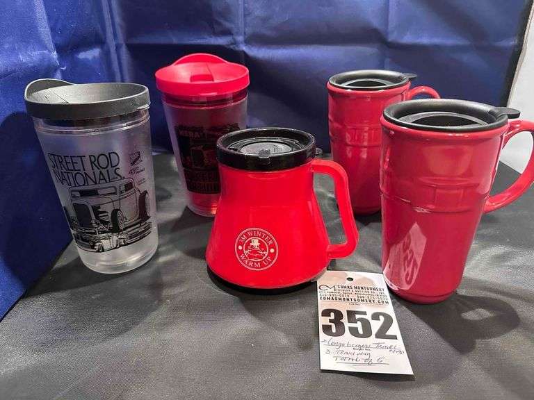 LOT 352 - 5-Total travel mugs 2-Longaberger Travel Mugs, 2-Tervis, 1- Aladdin