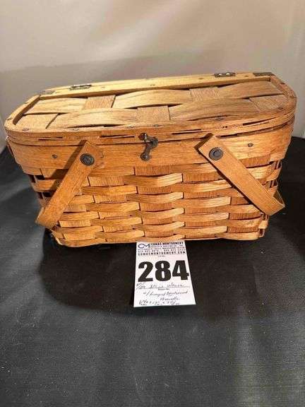 LOT 284 - Vintage Large Splint Weave with Picnic Basket Hinged Lid & Double Bentwood Swing Handles