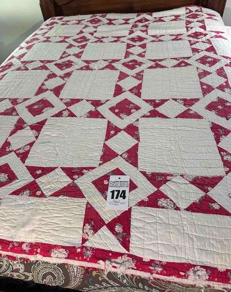 LOT 174 - Antique Quilt - Red & White Squares - Shows Wear