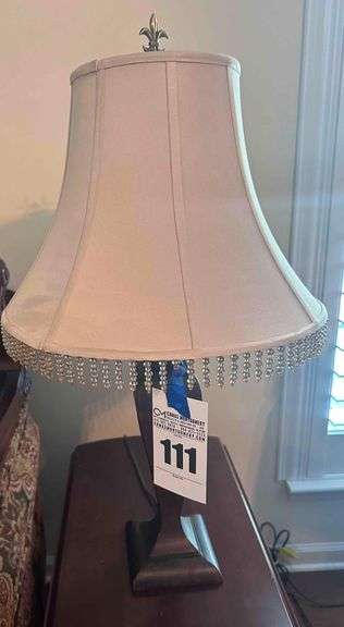 Nice table lamp, with a beautiful shade with crystals with a Fleur-de-lis finial