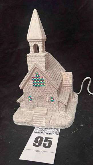 Works but the knob is missing for the music. Also has small chip on chapel steeple. Lights up and is 11" tall See pictures.