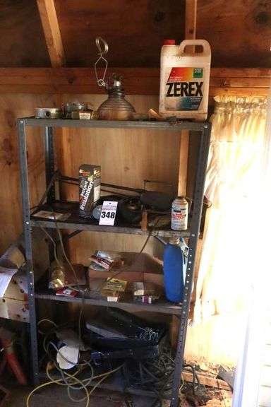 LOT 348 - Metal Shelf (56"x30"x12") with all items included (Lights, Shop Light, Black & Decker Sander, Paint items etc. **Buyer bring boxes to remove