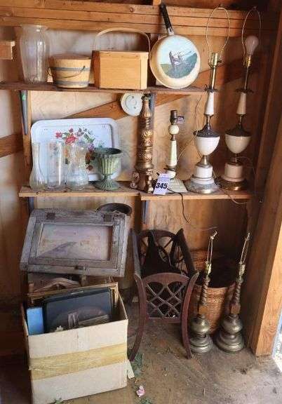 LOT 345 - Variety of items: Magazine Rack, Lamps, Hand painted items, trays, frames, shelves, vases etc. **Buyer bring boxes to remove