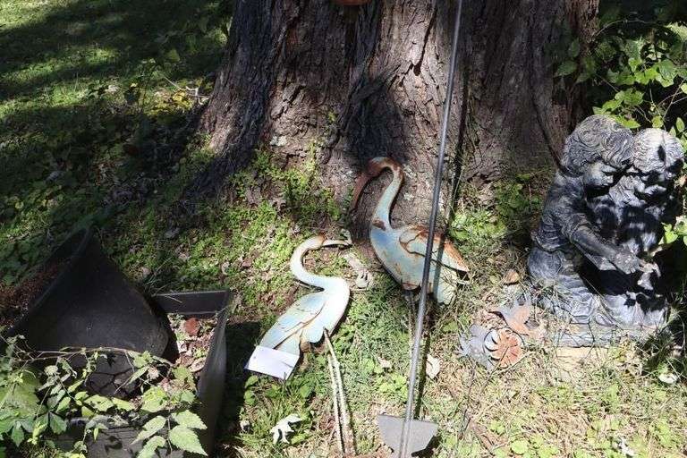 LOT 342 - Concrete Boy & Girl yard décor (some damage), planters, shepherd hook ell, cranes, etc.