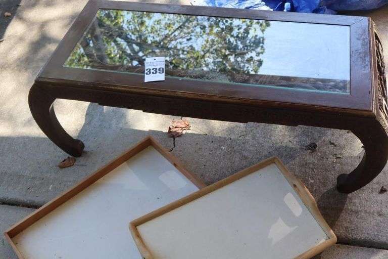 LOT 339 - Unique Carved Coffee Table with Glass Top and carved legs (16"x47"x19") & 2 trays