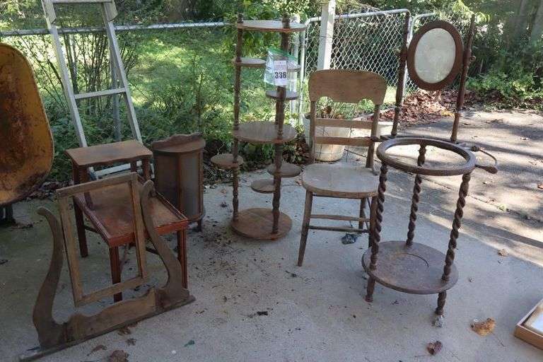 LOT 338 - Variety of wood items: Mirror Frame, Shelves, Chair, Glass Front Display cabinet - some need restoration