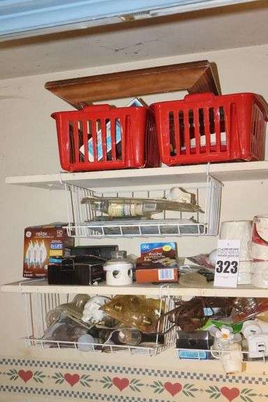 LOT 323 - Variety of items on Shelf: Hanging shelfs, air freshener, bulbs, shades for mini lamps and additional items **Buyer bring Boxes to remove items from shelves