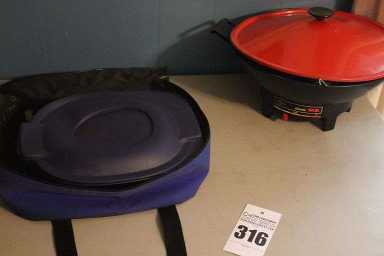 LOT 316 - Pyrex Portable 2 quart in travel bag, heat pad and lid & West Bend Electric Wok