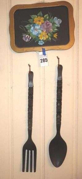 LOT 285 - 2 Vintage Carved Wood Fork/Spoon(34") and Hand painted Decorative tray (16"x22")