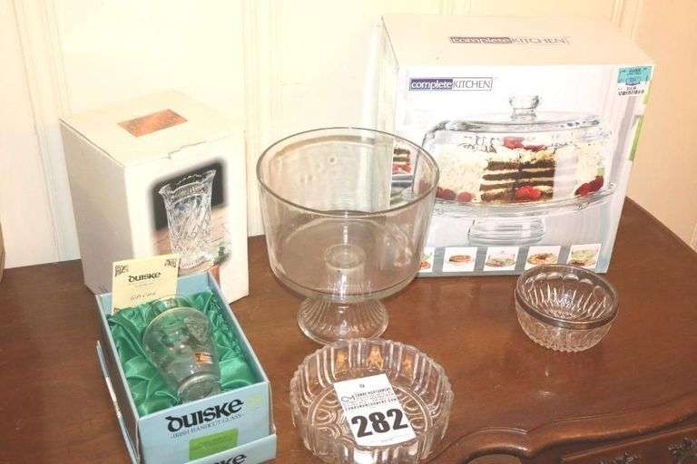 LOT 282 - Variety of Glass Serving Pieces - Domed Cake Pan (New in Box), Vase (new in Box), Bowls, Trivet Dish, Duske Irish Hand cut Crystal Glass Vase in Box