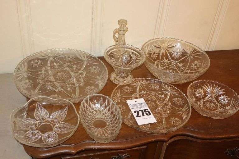 LOT 275 - Variety of Glass Serving Pieces - Platter, Bowls, Plates, cruet Jars, etc.