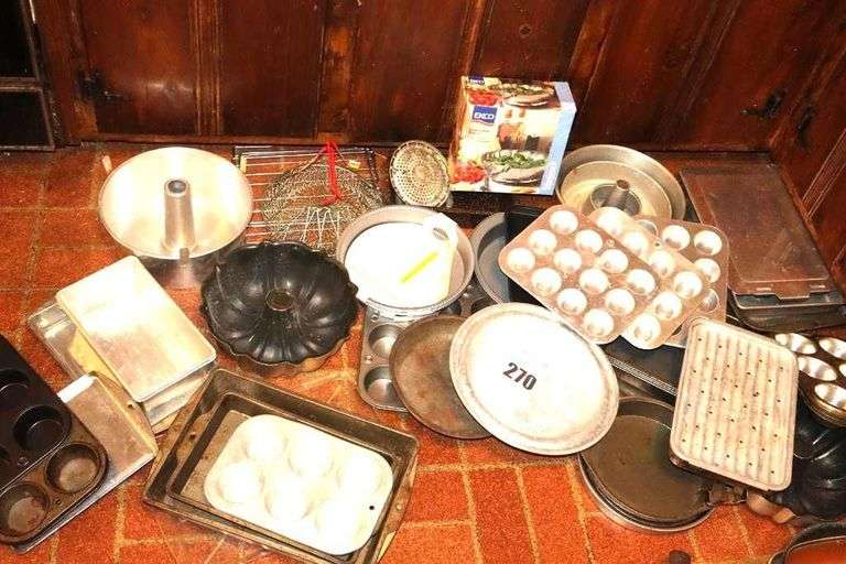 LOT 270 - Variety of Baking pans: Cookie sheets, Cake pans, Pizza Pans, muffin pans, Loaf Pans, Bunt Pans cooling racks, steamers etc.