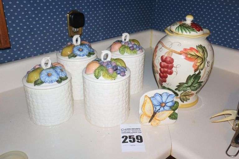 LOT 259 - Hand made Ceramic Canister Set with napkin Holder and Cookie Jar