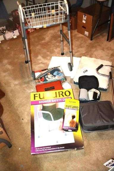 LOT 238 - Variety of Medical/Health items: Rolling Walker with basket, Bath Seat, Cushion Seat, Blood Pressure Cuff, Massager, Breathing Machine etc.