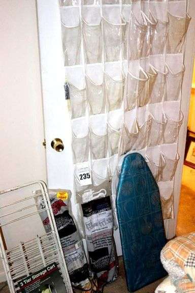 LOT 235 - 2 Over the Door Shoe holders, Iron, Iron Board, 2 closet shoe racks, & 3 tier storage cart (needs to be put together)
