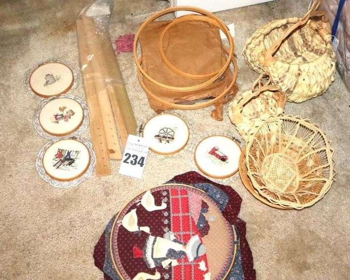 LOT 234 - Baskets, Quilting rack, Needlepoint, variety of cross-stitched wall items