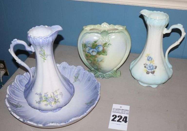 LOT 224 - Variety of Handmade Ceramic Items: Bowl & Pitcher, Pitcher (teal with flowers), Oval Shape Vase (teal/blue)