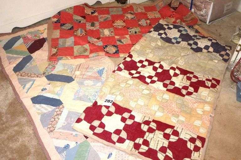 LOT 202 - 3 Antique Hand Made Quilts (some wear) - Pieced Quilt (73"x66"), Squares (65"x74") & Circle/Squares (58"x66")