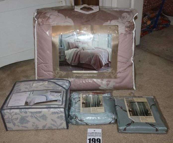 LOT 199 - Queen Size Comforter, 2 window panels (in package) & Queen Reversable Duvet Cover Set (in Package)