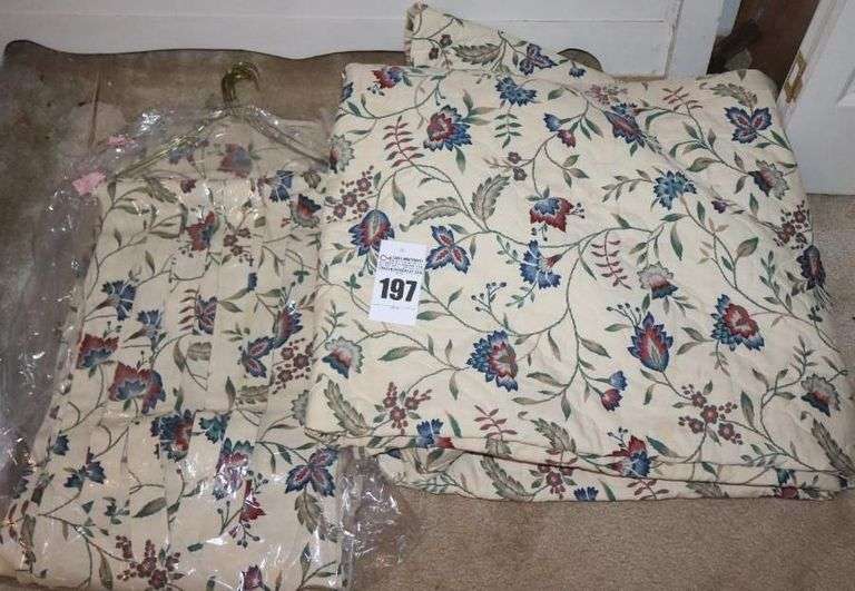 LOT 197 - Queen Comforter, set of matching curtains (have been cleaned on hangers)
