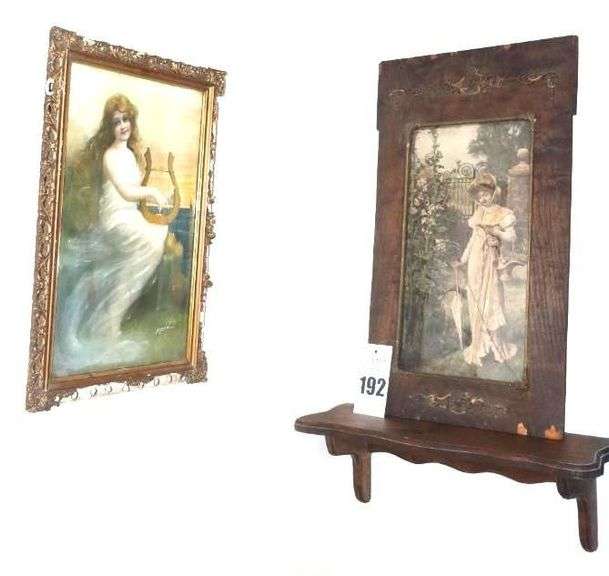 LOT 192 - Wood wall shelf (8"x20"x8") & 2 Vintage Wall Art Pieces with Unique Frames (24"x14" & 18"x12")