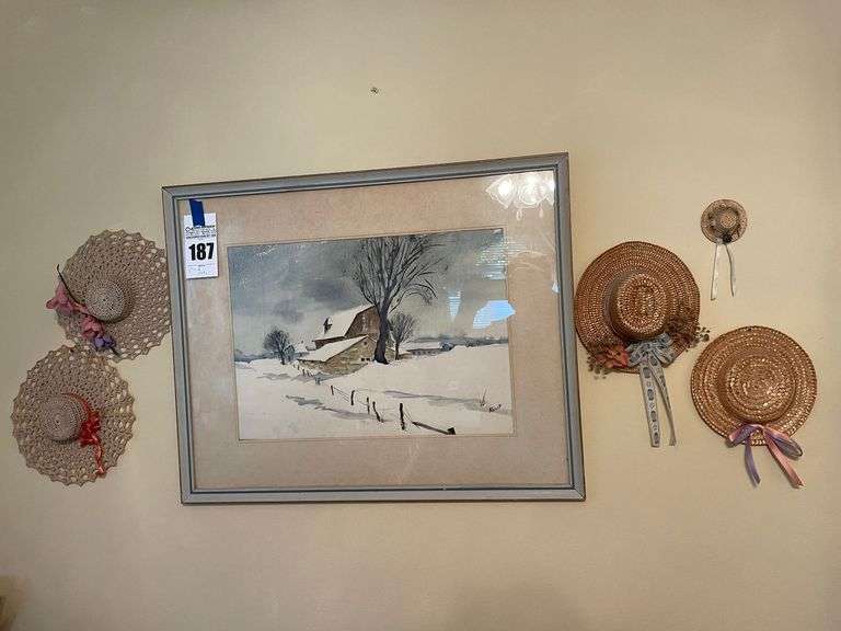 LOT 187 - Framed and Matted Snow scene Wall Art Print (24"x25.5") & 5 Straw Hats for décor