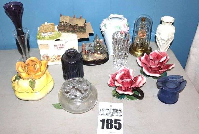 LOT 185 - Variety of Decorative items: 2 Capodimonte Porcelain flowers for Italy, lidded containers, vintage Blue Glass ash Tray Top Hat, Variety of Bud Vases etc.