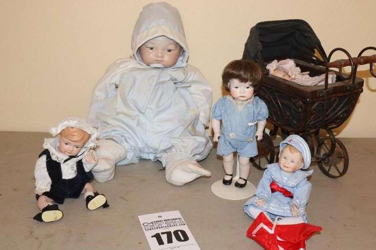 LOT 170 - Variety of Bisque/Porcelain Dolls - one in carriage, one on stand etc.