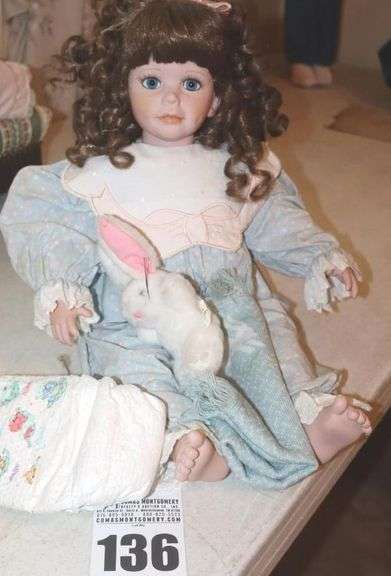 LOT 136 - Porcelain Collector Doll From Hamilton Heritage 1992 - "Kristen" made by Laura Cobabe - numbered 0230A - with blanket & rabbit