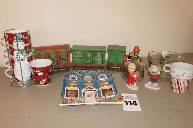 LOT 114 - Variety of Decorative Christmas Items; Advent Train, Tray, cups, Bowl etc.