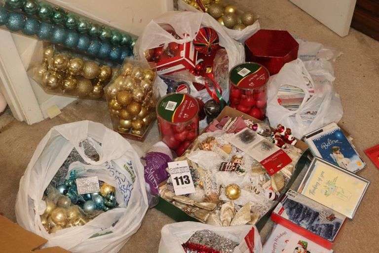 LOT 113 - Variety of Christmas Balls, & decorative item (cards new in box), balls, wrapping - several still in packaging