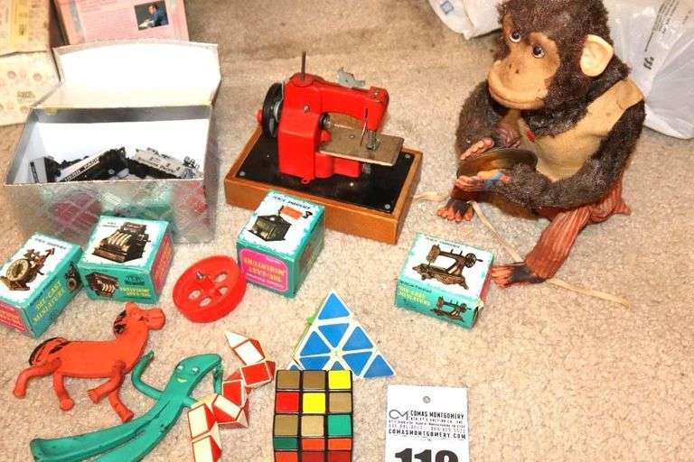 LOT 112 - Variety of Vintage Kid Toys items: sewing machine, monkey, train etc.