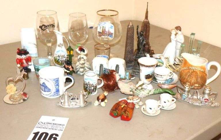 LOT 106 - Variety of Items (Glass, Brass, Porcelain, Shells) of Collector Items from Travels - Salt & pepper set, vases, dolls, cup & saucers, decorative items etc. -20+